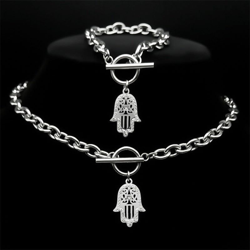 Make a statement with this Hamsa Pendant Necklace and Bracelet Set, a beautiful blend of elegance and symbolism. Featuring intricately designed Hamsa charms adorned with shimmering crystal accents, this set represents protection, blessings, and positive energy. Crafted with a durable link chain and finished with a stylish toggle clasp, it’s available in both 18K Gold-Plated and Silver-Plated options, allowing you to choose your perfect look.