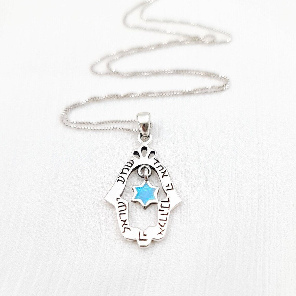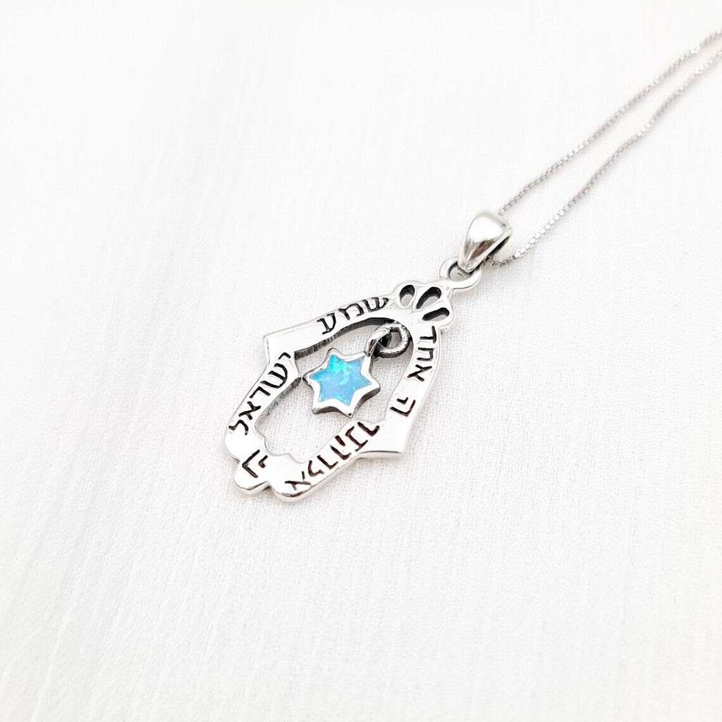 Showcase your faith with the Shema Israel Hamsa Necklace with Star of David & Blue Opal. This exquisite necklace features a beautifully crafted Star of David pendant with a blue opal center, set in sterling silver, and inscribed with the Shema Israel verse in Hebrew script.