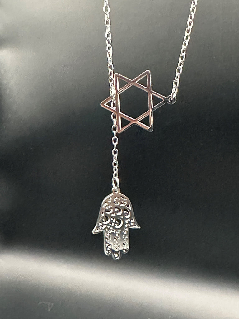 Celebrate spirituality and style with this graceful necklace featuring a Star of David paired with an intricately designed Hamsa charm.