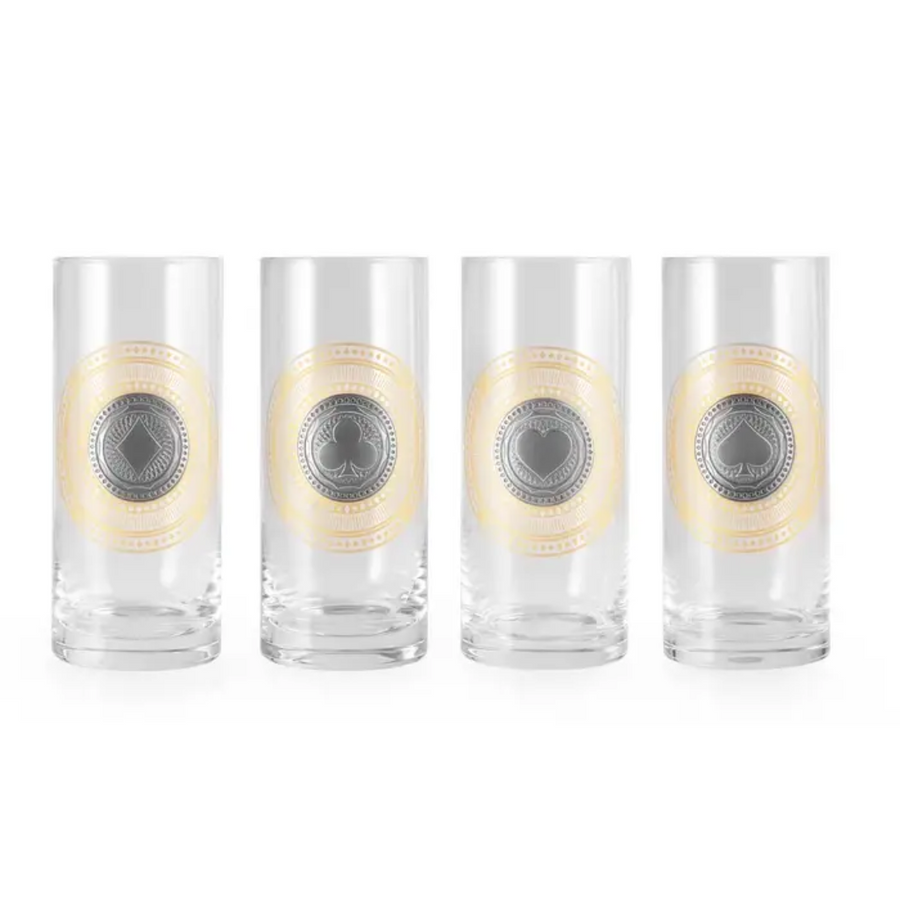 Elevate your cocktail experience with the Ace Highball Quartet. Each glass features a pewter disc engraved with gold-toned roundels and suit-inspired crests, incorporating Victorian-Edwardian decorative motifs. This design ensures easy drink identification and adds a touch of elegance.