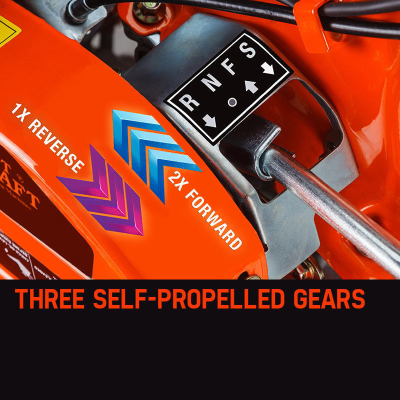 The USA designed BT-777 gets the job done faster with an 800mm tiller scope - over 35% wider than most alternative designs, greatly reducing the time it takes to prep your soil. It boasts an impressive 350mm tilling depth, made possible due to its non-restrictive safety shields. The unit features 3 self-propelled gears - 2 forward and 1 reverse - that drive the machine so you can get loads of work done with little fatigue. The superior hard-drawn and synchronous-rotating steel tiller blades offer superior durability in tough rocky soil, and one pass is all it takes to have finely milled and well-aerated earth.