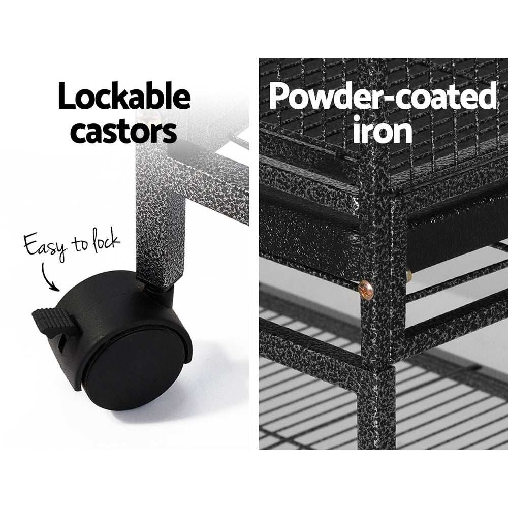 With roomy accommodation for birds of various sizes, the i.Pet Bird Cage is definitely the most comfortable roost for your fine-feathered friends. Made of high quality and durable wrought iron with a non-toxic powder-coated finish, the cage comes with a large access door with secured locks, two small food access windows, two timber perches, four food and water bowls and a removable slide-out tray for easy clean up. Better still, the palatial cage is set on a sturdy stand that features a bottom shelf for extra storage space and strong legs with castor wheels attached for easy mobility.