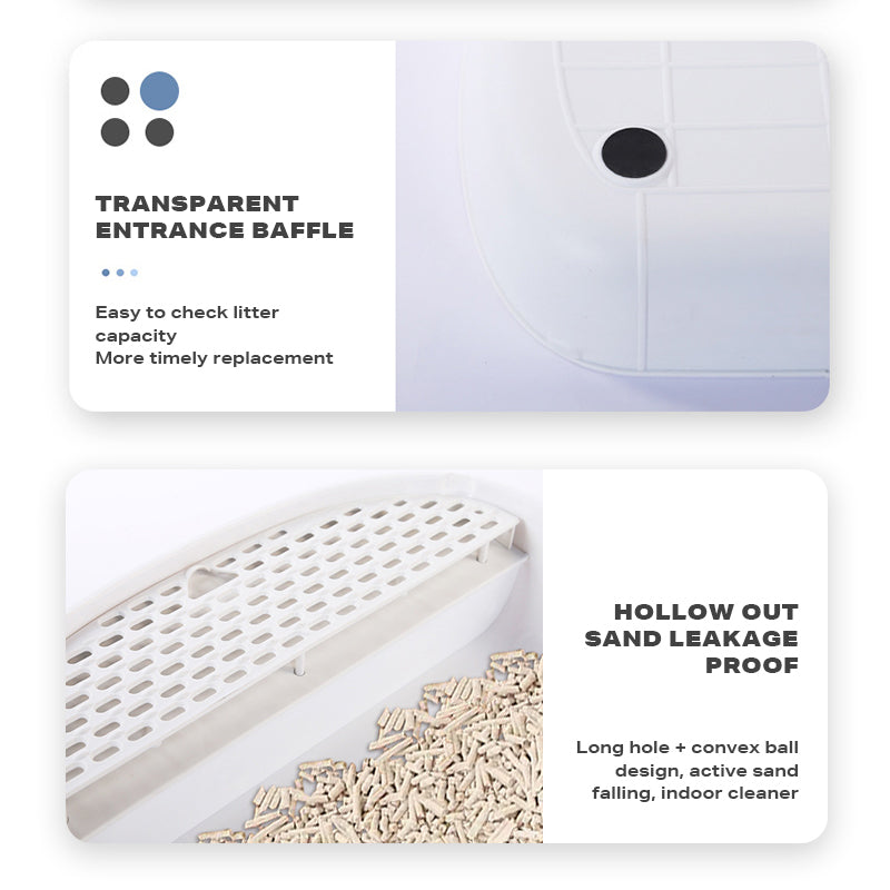 • One-Way Door: The front door of the litter box is only used for in and out, to prevent the litter spill outside, the cat could go in and out through the top door at will, which is benefitial to exercising the cat's body and increasing the fun of life. The hollow holes at the top of the litter tray filter the litter, so that when the cat jumps out the litter will fall back into the tray without causing a mess and reducing the number of cleanings.