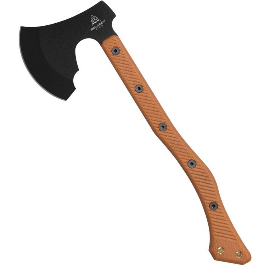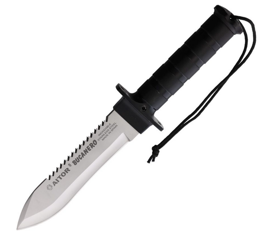 A fixed blade knife with a black micarta handle, aluminum guard and pommel, and a brown leather belt sheath.