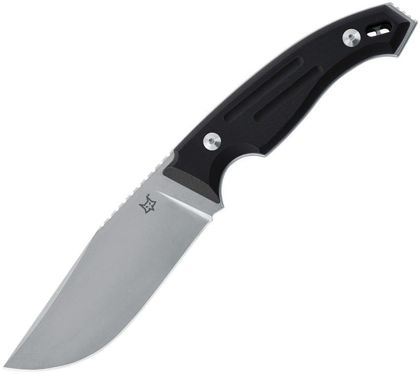 A fixed blade knife with a satin finish blade and a brown leather handle with a metal guard and pommel.