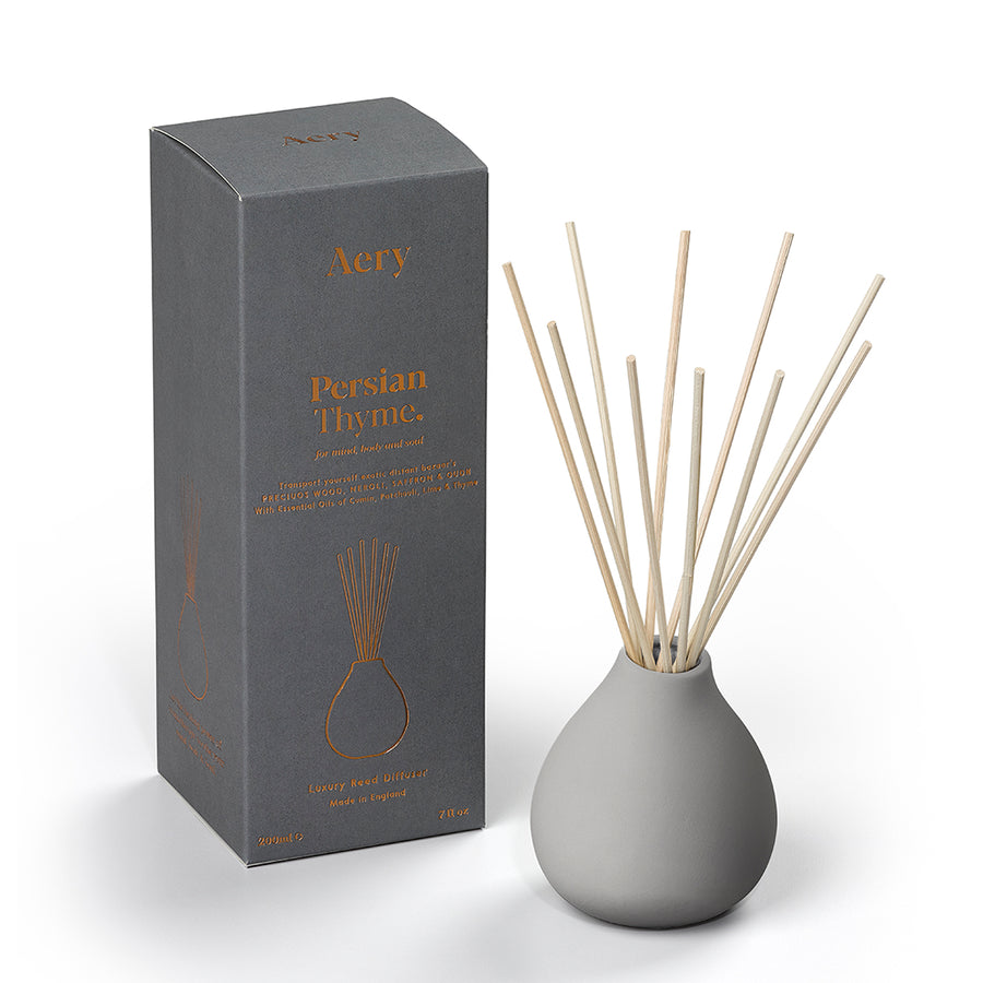 A set of three beeswax candles in matte colored ceramic pots, presented in a gold foiled gift box with the brand name 'Aery Living' on it.