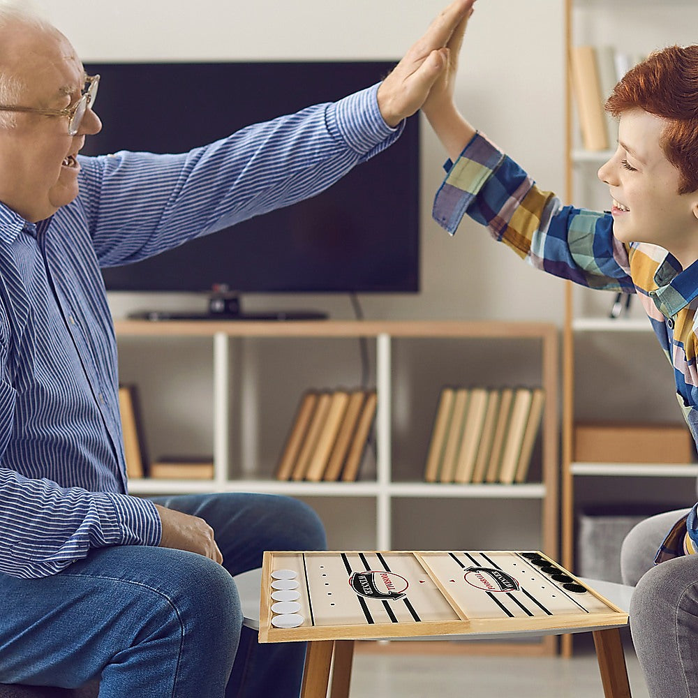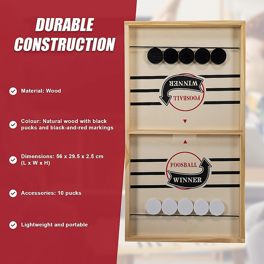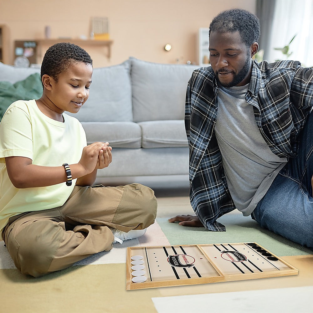 This game is easy to learn even beginners can get up to speed in minutes. Just use a single finger to pull back the inset elastic band to shoot all the pucks into your opponent's court. The winner of each round is the first player to get all their pucks into your opponent's court. The first player to win two rounds wins the game. You don't need to take turns you just keep shooting until all your pucks are on the other side. It's a lot like the ever-popular foosball, but in a hockey setting. It's an excellent gift for the table game lover in your life.