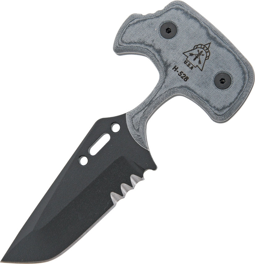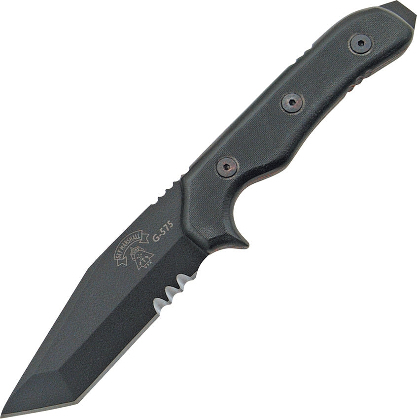 A black fixed blade knife with a serrated edge and a finger ring, overall 5.88 inches long.