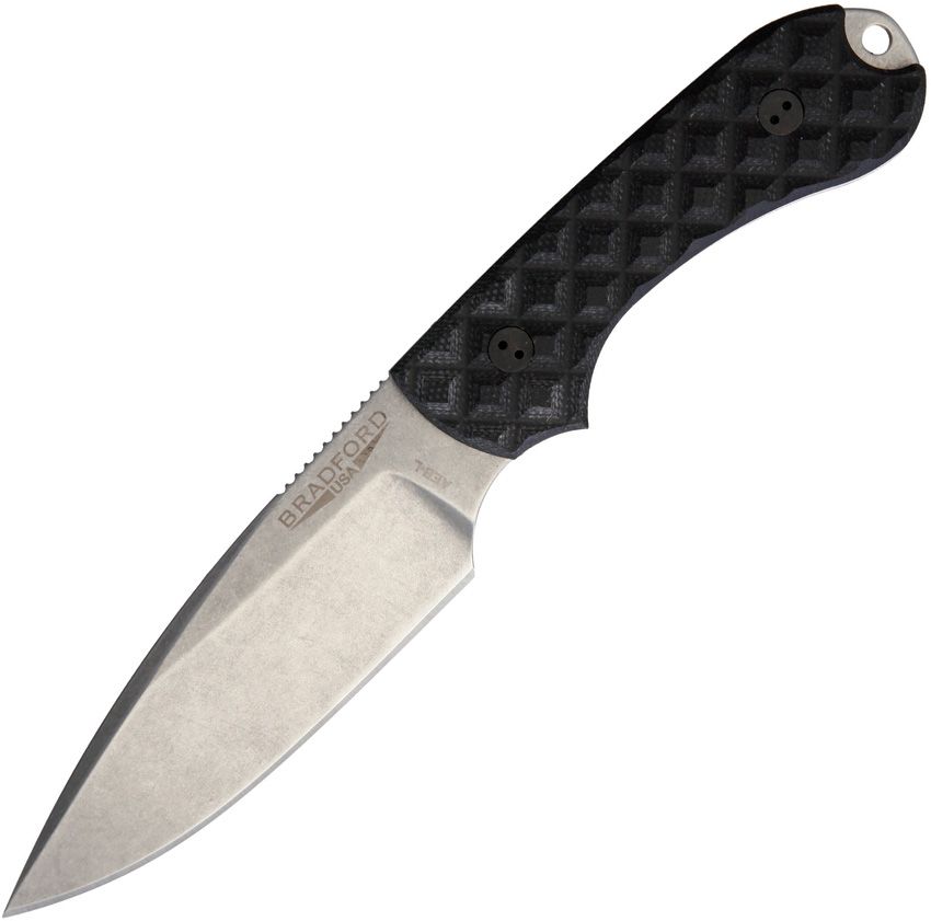 A Blackhawk fixed blade knife with a black PVD coated partially serrated D2 tool steel blade, black Zytel handle, and a serrated top edge. The knife has an overall length of 11 inches and a lanyard hole at the handle's end.