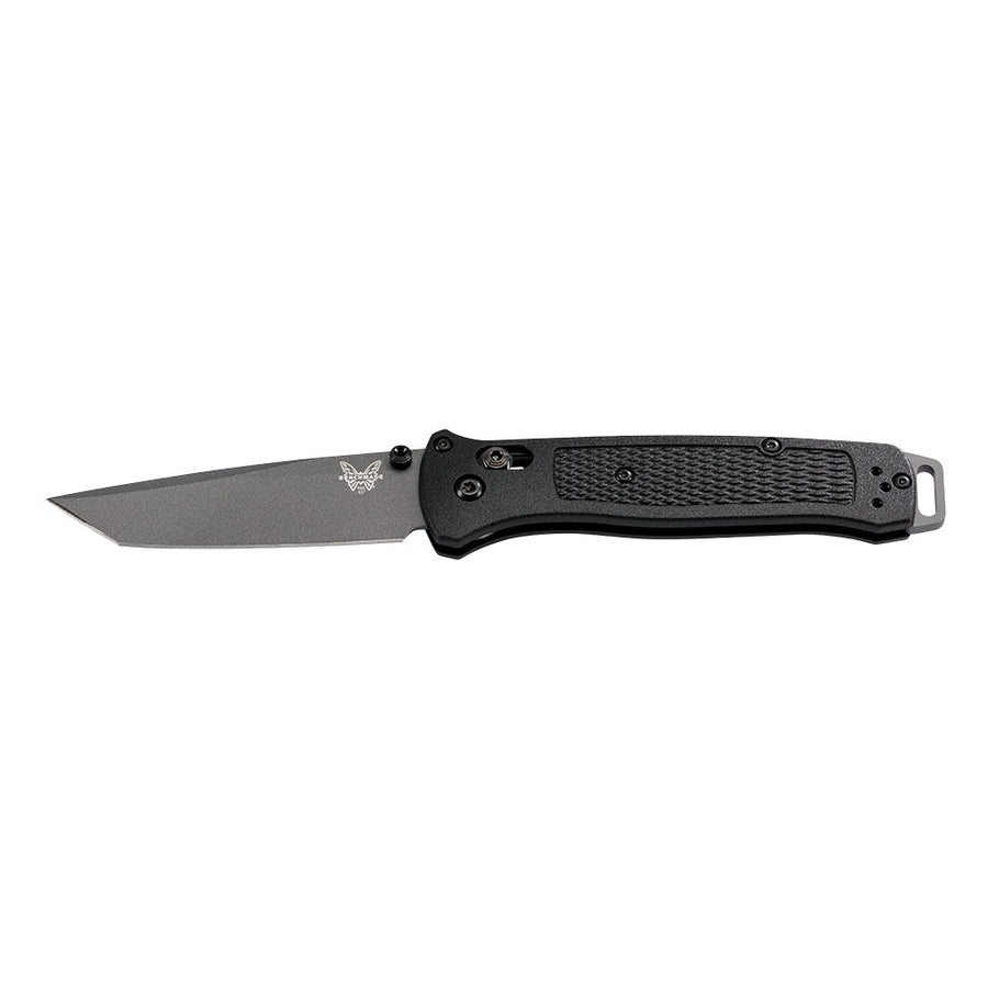 A Benchmade 533-3 Mini Bugout folding knife with a black carbon fiber handle and a silver-colored blade.