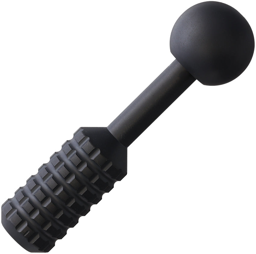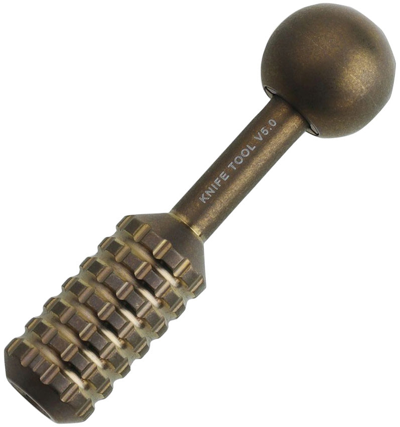 A titanium bodied camping tool with a ball-shaped end and a textured grip surface, featuring a stonewash finish.