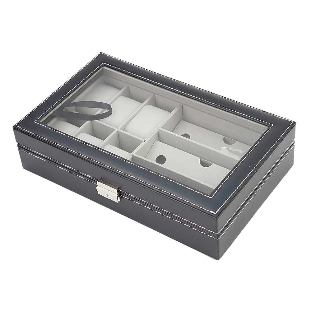 Need a spot to stash both your watches and your shades? This elegant display box from Randy & Travis Machinery has a place for both—and your prescription glasses as well. In gorgeous PU leather, this case features a transparent glass lid to di...