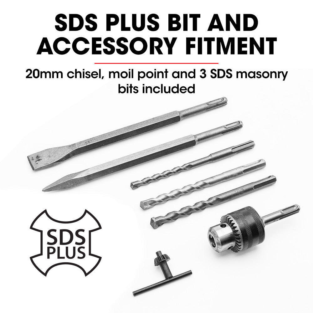 The Baumr-AG1500W SDS Plus comes with a moil tool (pyramidal point) and a 20mm chisel for tile removal, light demolition and rehab work! This outstanding package includes 3 Bonus Carbide SDS-Plus masonry bits. The SDS chuck is also compatible with standard SDS bits and tools. Plus, it comes with an SDS-Plus adaptor to attach a standard chuck for use with standard drill and driver bits.