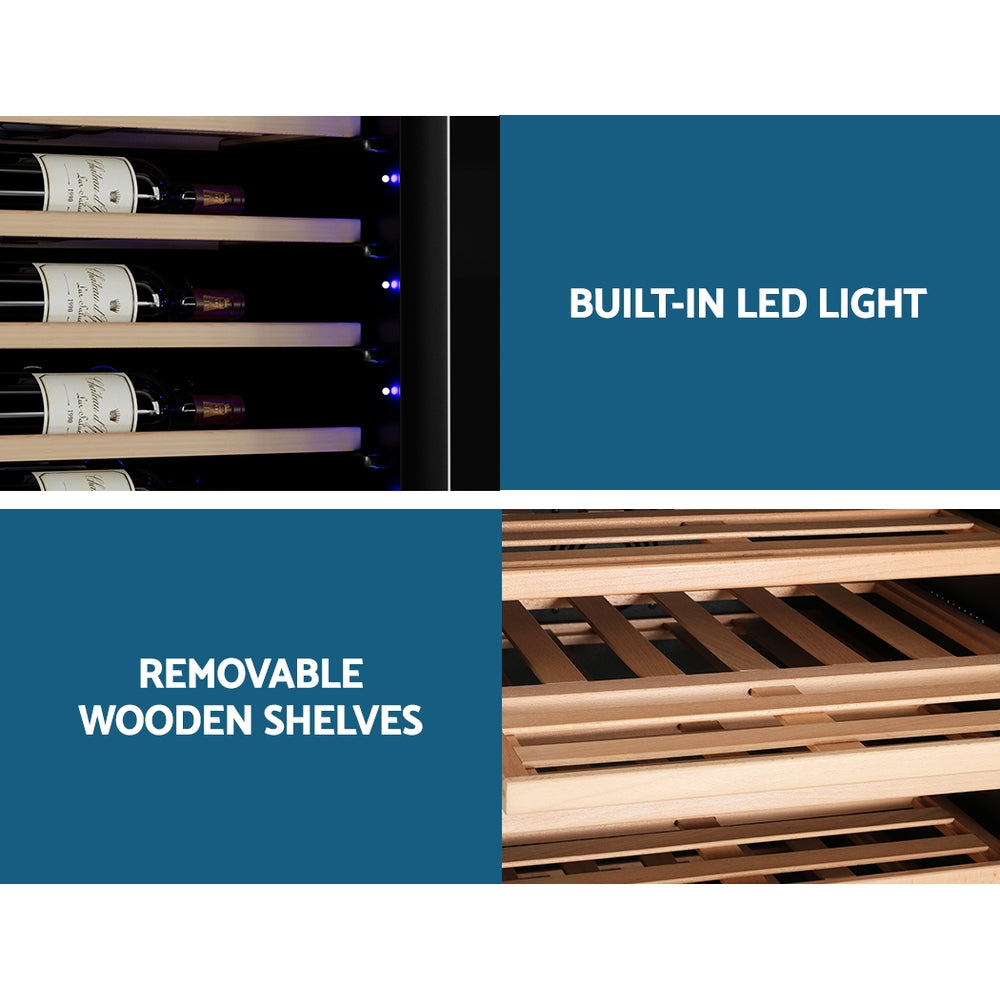 Read moreNeed a reliable way to store your wine collection? Look no further than our Devanti Wine Cooler. Utilising the latest high-precision compressor cooling technology, our wine cooler ensures your favourite vintages are well kept at their recommended temperatures with its circulated cool air. The cooler has a dual zone system with two separate temperature-controlled zones, ensuring perfect cooling temperatures for both white and red wines. The temperature can be set between 5°C and 13°C for the upper zone (which is suitable for dry white and sparkling wines), and between 12°C and 18°C for the lower zone (which is suitable for red wines). The digital control panel makes for easy temperature adjustments while the built-in LED lights help you to see your wines in the best light. The stylish design stores up to 128 bottles of wine in a neat and tidy wood shelving system. Better still, the double-glazed glass door is UV-resistant and provides excellent insulation. The ensemble works quietly and efficiently and has a built-in lock for total peace of mind. Suitable for both home and commercial use. Treat your vintage collection with the care it deserves - invest in a Devanti Wine Cooler today.